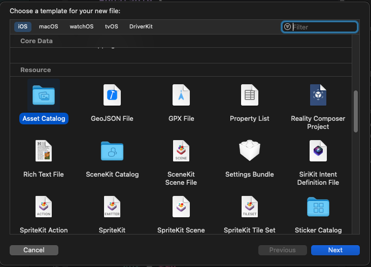ํ ์คํธ์ฉ JSON ํ์ผ์ ์ดํ์๋ ์ฌ์ฉํ์ง ์์ ๊ฒ์ด๊ธฐ์ test ํด๋์ ๋ฐ๋ก Asset catalog๋ฅผ ๋ง๋ค์ด์ ๊ทธ๊ณณ์์๋ง ๋ฃ์ด๋๊ณ ์ฌ์ฉํ๊ณ ์ถ์๋ค. ๋๋ฌธ์ ํด๋๋ฅผ ํ๋ ๋ง๋ค์ด์ ์ด๋ฆ์ Json.xcassets ์ผ๋ก ์ ์ธํ๊ณ ๊ทธ ์์ ํ์ผ์ ๋ฃ์๋ค. ๊ทธ๋ฐ๋ฐ asset catalog์ ๋ชจ์์ด ๊ธฐ์กด์ ๊ฒ๊ณผ๋ ๋ฌ๋๋ค. ํ์ธํด๋ณด๋ asset catalog๋ฅผ ๋ง๋ค๋๋ ๋จ์ํ๊ฒ ํด๋๋ฅผ ๋ง๋๋ ๊ฒ์ด ์๋๋ผ File → New → File์ ํ๊ณ ๋ค์ด๊ฐ Resource์ Asset Catalog๋ฅผ ์ ํํ์ฌ ๋ง๋ค์ด์ผ ํ๋ค.
